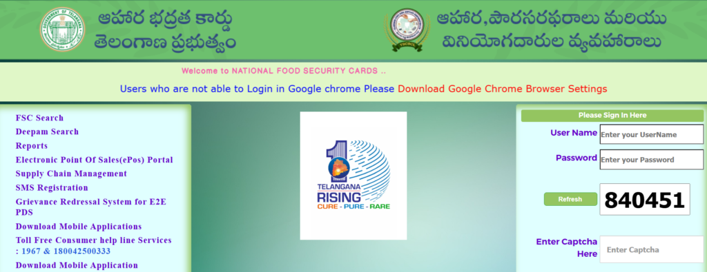 The Telangana Ration Card, officially known as the Food Security Card (FSC), is issued by the Civil Supplies Department of Telangana. It allows eligible families to receive subsidized food grains under the Public Distribution System and access various government welfare schemes.